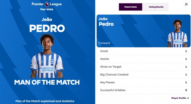 傳射建功!英超官方:若昂-佩德羅當(dāng)選曼城1-2布萊頓全場(chǎng)最佳