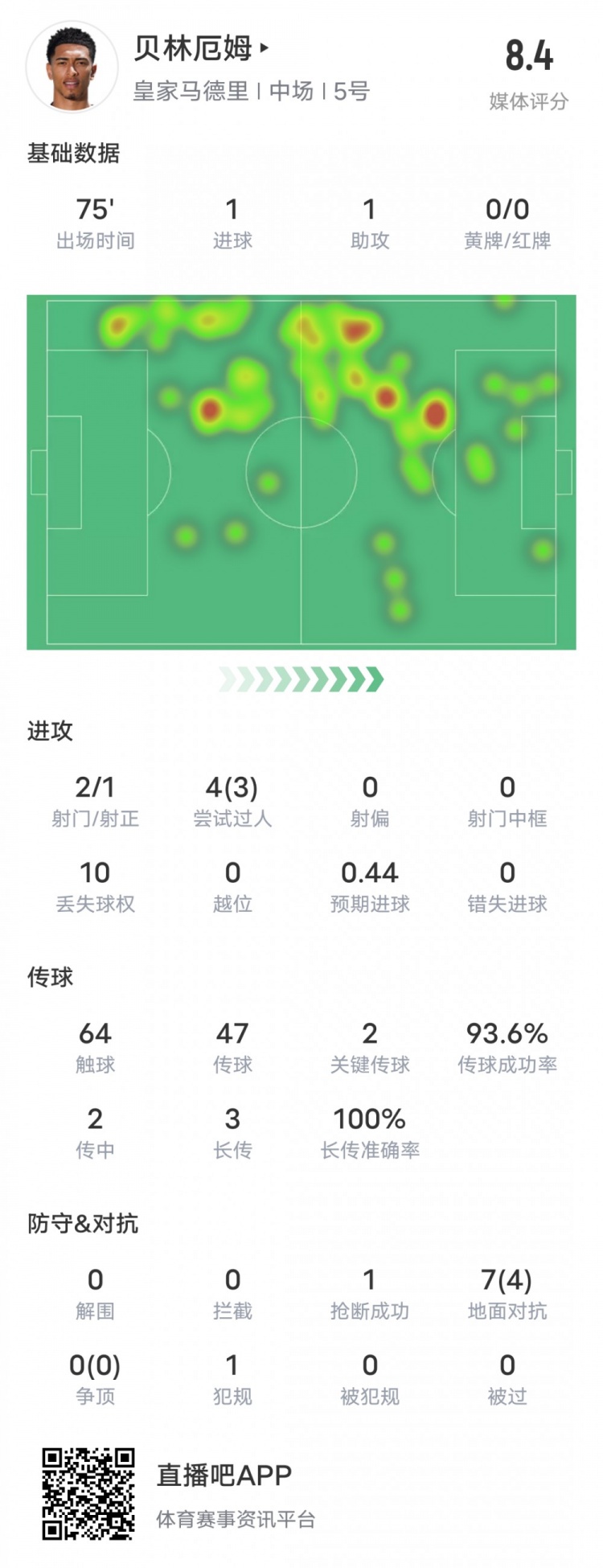 貝林厄姆本場(chǎng)比賽數(shù)據(jù):傳射建功&3過(guò)人成功2關(guān)鍵傳球,評(píng)分8.4