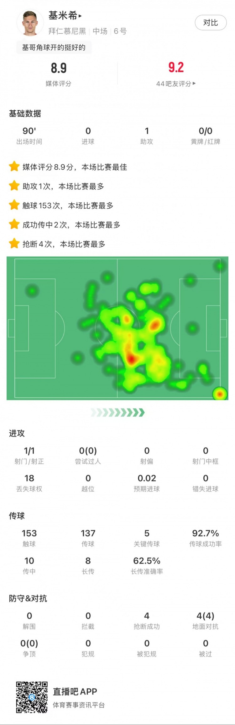 基米希全場(chǎng)數(shù)據(jù):1次助攻,5次關(guān)鍵傳球,評(píng)分8.9全場(chǎng)最高
