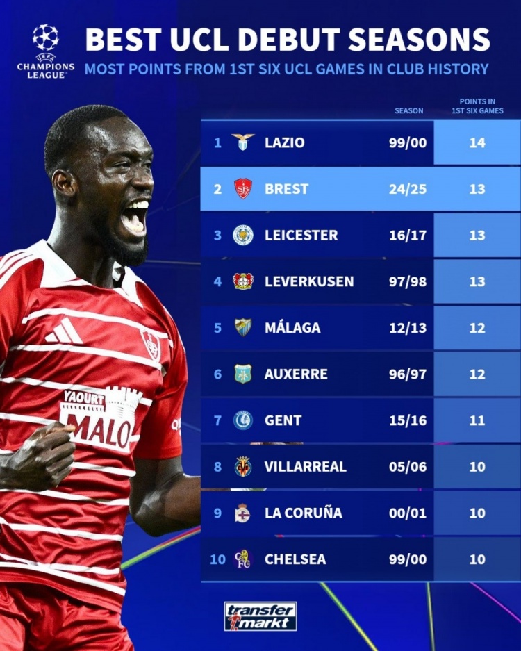 布雷斯特歐冠首秀前6場拿到13分,僅次于1999-2000拉齊奧