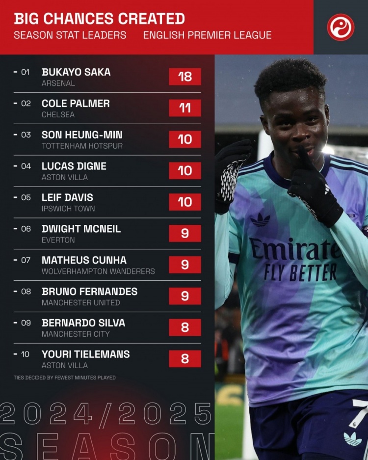 本賽季英超創(chuàng)造重大機(jī)會(huì)榜:薩卡18次居首,帕爾默11次第二