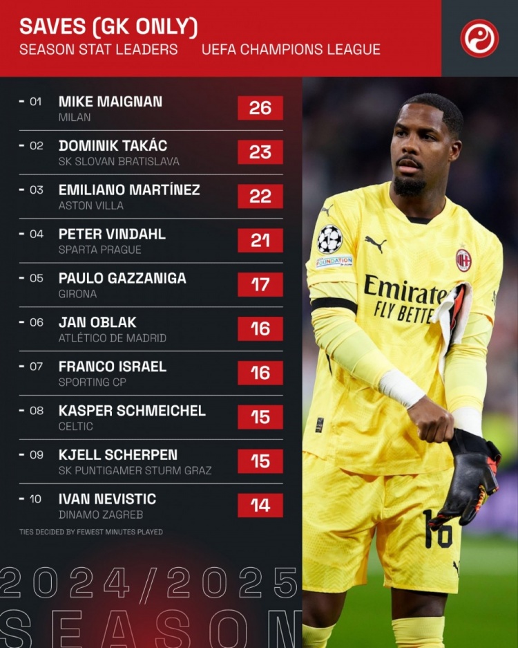 本賽季歐冠撲救次數(shù)榜:邁尼昂26次居首,大馬丁22次第三