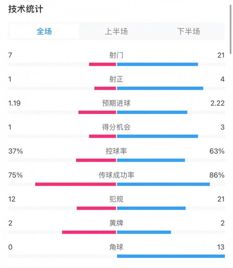 國米1-0阿森納全場數(shù)據(jù):射門7-21,射正1-4,角球0-13
