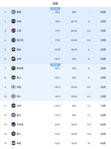 力擒西部第二湖人14勝12負(fù)追平快船排名第十 領(lǐng)先馬刺1個(gè)勝場