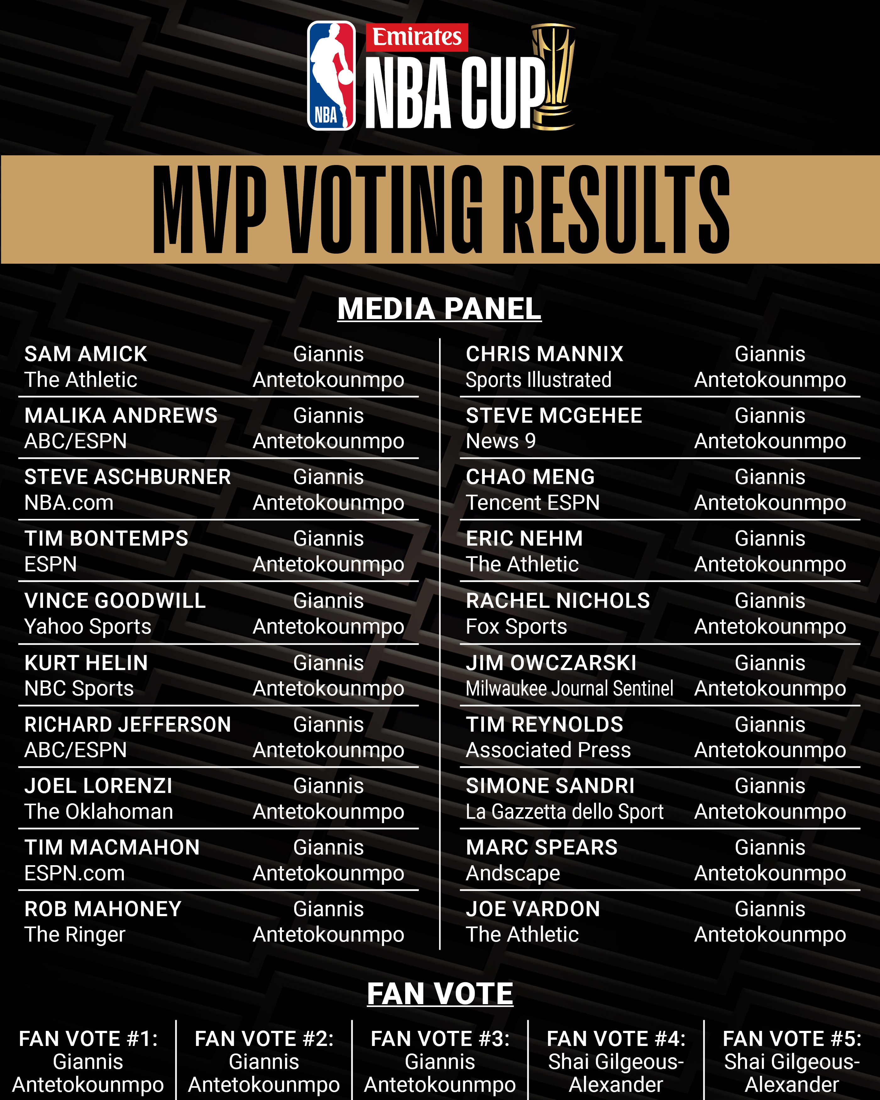 NBA杯MVP投票結(jié)果明細(xì):字母哥在媒體投票中獲得全票(20張),在球迷投票中獲得3票(一共5票,有2票給亞歷山大)。