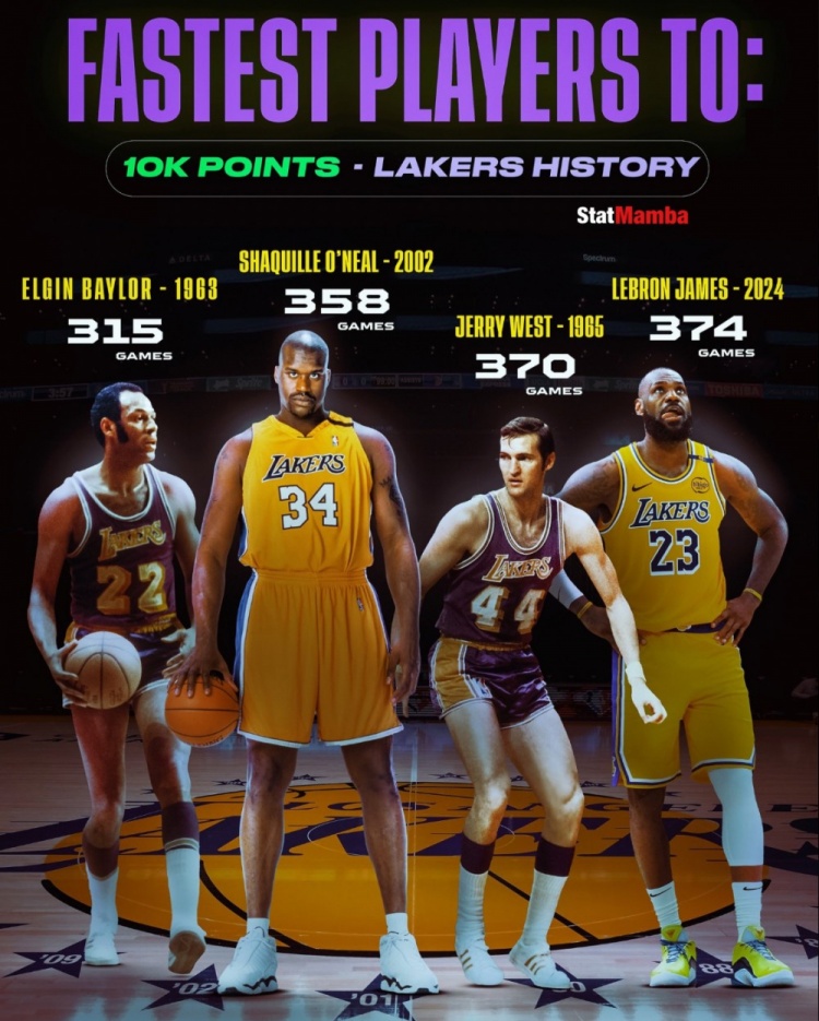 在本場比賽中,詹姆斯湖人生涯總得分突破10000大關,這是他效力于湖人的第374場常規(guī)賽,隊史第四快,僅次于埃爾金-貝勒、奧尼爾和杰里-韋斯特。