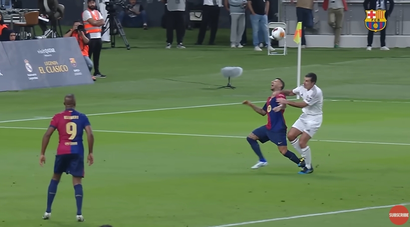 比賽下半場,菲戈在禁區(qū)內(nèi)和夸雷斯馬發(fā)生碰撞,裁判吹罰菲戈犯規(guī),判給巴薩點球。