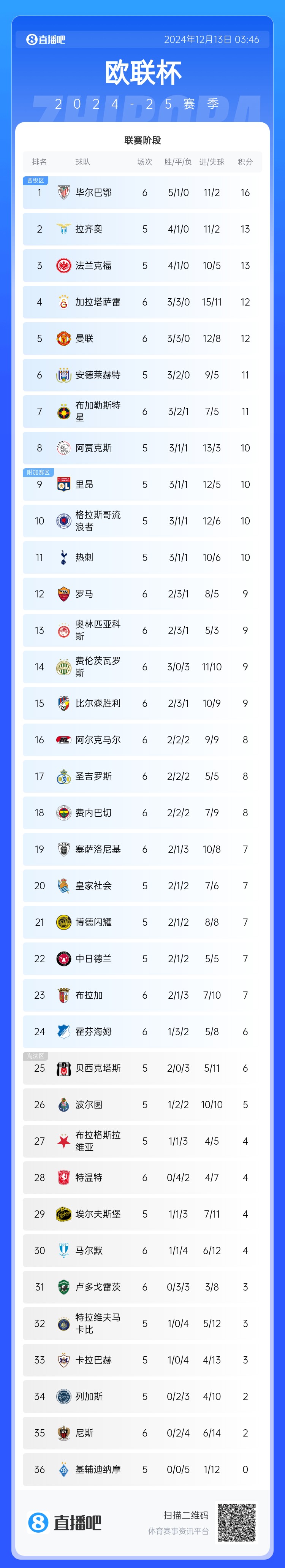 目前,曼聯(lián)在英超僅位列第13位,在歐聯(lián)杯暫升第5位。