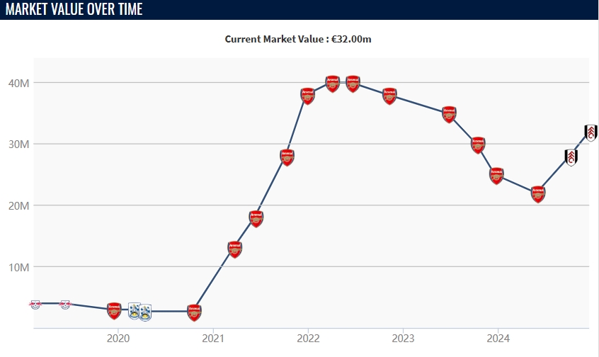 今夏阿森納以2700萬英鎊+700萬英鎊浮動(dòng)的轉(zhuǎn)會(huì)費(fèi)將24歲的史密斯-羅出售至富勒姆,球員本賽季代表富勒姆聯(lián)賽出戰(zhàn)16場(chǎng),已經(jīng)貢獻(xiàn)3球2助。球員在2022年巔峰身價(jià)為4000萬歐元,目前球員距離這一數(shù)字還差800萬歐。