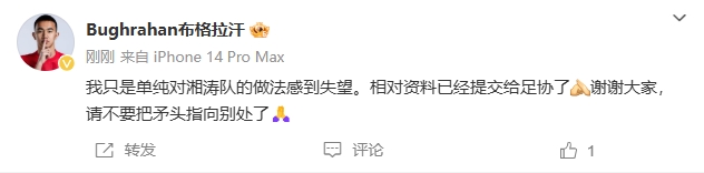 現(xiàn)布格拉汗將原微博刪除,并進(jìn)行了澄清:“我只是單純對湘濤隊(duì)的做法感到失望,相關(guān)資料已經(jīng)提交給足協(xié)了。謝謝大家,請不要把矛頭指向別處了 ??? ”