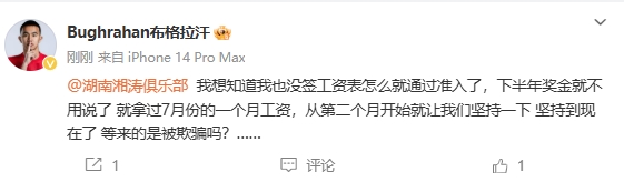 12月20日訊 布格拉汗質(zhì)疑湖南湘濤,稱只拿過7月份的一個月工資,不知俱樂部怎么過的準(zhǔn)入。