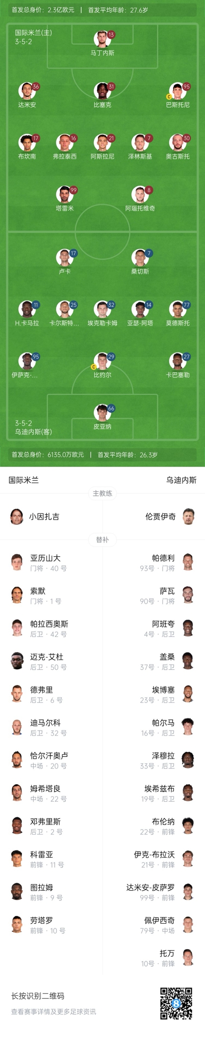 烏迪內(nèi)斯替補(bǔ):90-勒茲萬(wàn)-薩瓦、93-帕德利、4-阿班夸、16-馬特奧-帕爾馬、19-埃希茲布、23-埃博塞、33-澤穆拉、37-阿萊克斯-蓋桑德、79-佩伊西奇、10-托萬(wàn)、21-伊克爾-布拉沃、22-布倫納、99-皮薩羅