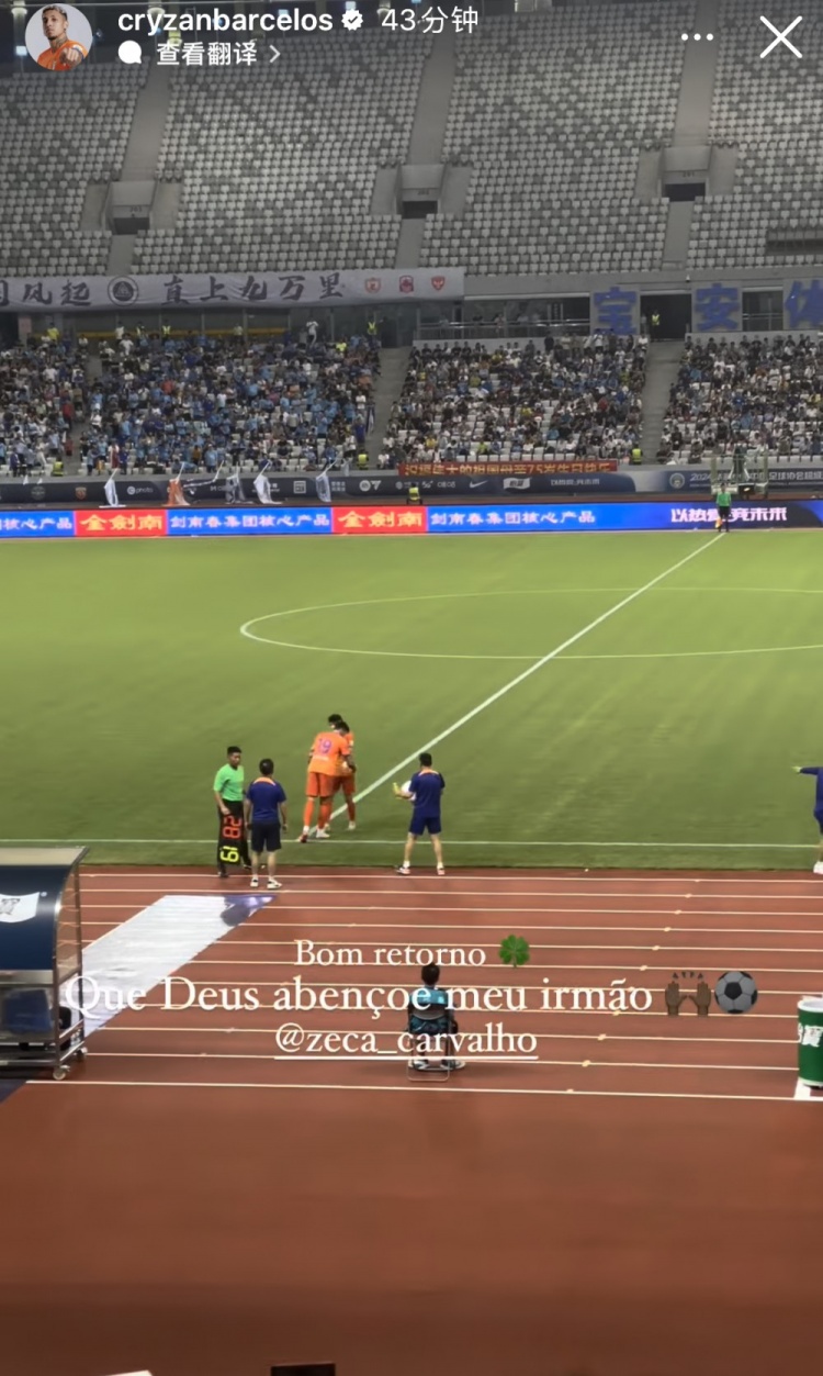 比賽第80分鐘,澤卡替補(bǔ)出場(chǎng),加盟247天后終于迎來(lái)了他在泰山的首次亮相??死咨T谏缃幻襟w上更新了澤卡替補(bǔ)出場(chǎng)的動(dòng)態(tài),并寫道:“美好的回歸!愿上帝保佑我的兄弟!”