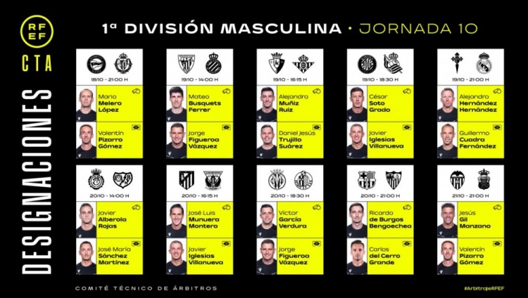 西甲聯(lián)賽第10輪具體裁判安排如下: