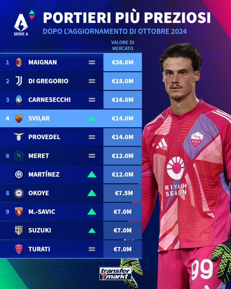 意甲門將德轉(zhuǎn)身價(jià)榜:邁尼昂3800萬歐居首,鈴木彩艷700萬歐第9