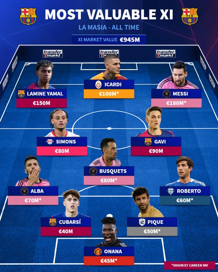 拉瑪西亞歷史身價最高陣:梅西領(lǐng)銜,伊卡爾迪、亞馬爾、加維在列