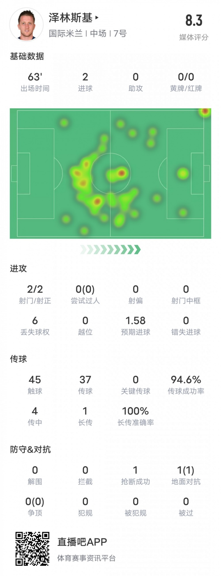 澤林斯基本場數(shù)據(jù):2進球1搶斷&傳球成功率94.6%,評分8.3