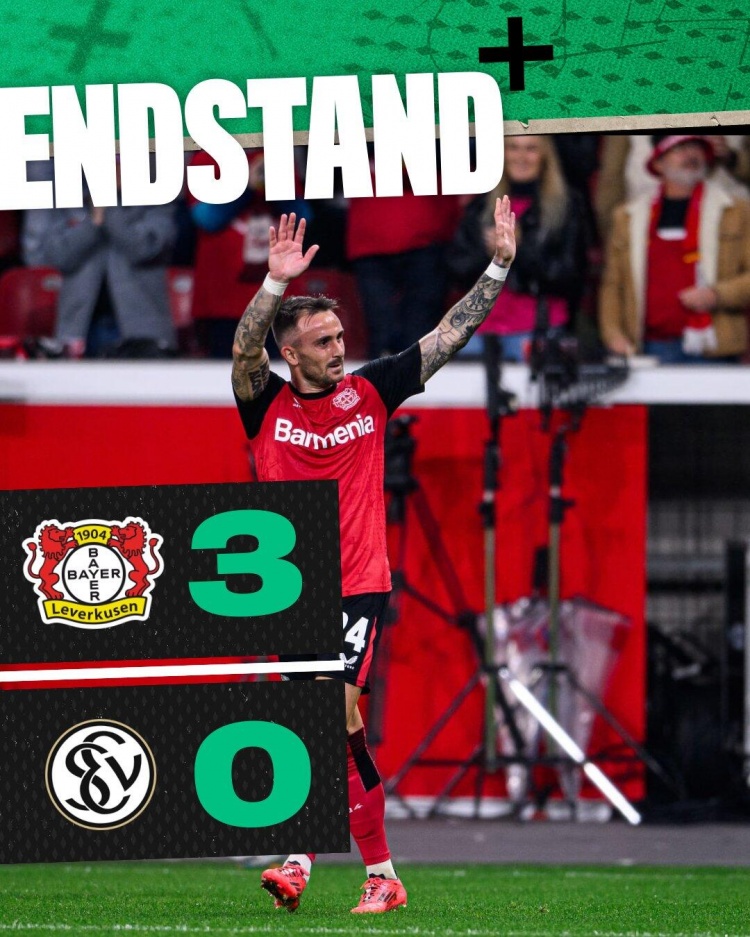 勒沃庫森出場陣容:17-科瓦爾、23-穆基勒、4-若納坦-塔、12-塔肯索巴、19-泰拉(69’20-格里馬爾多)、25-帕拉西奧斯、34-扎卡(70’10-維爾茨)、13-阿圖爾、7-霍夫曼(79’8-安德里希)、24-阿萊克斯(87’40-奧耶卡)、14-??耍?9’22-博尼法斯)