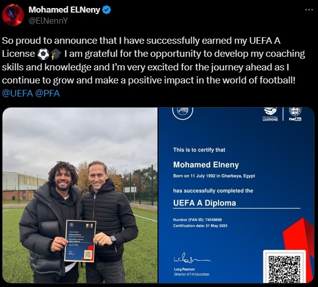埃爾內(nèi)尼寫道:“成功獲得歐足聯(lián)A級證書太令我自豪了!我感恩獲得開發(fā)教練能力和知識的這個機會,我還在繼續(xù)成長,并期待未來的旅程,期待在足球世界里造成影響。”