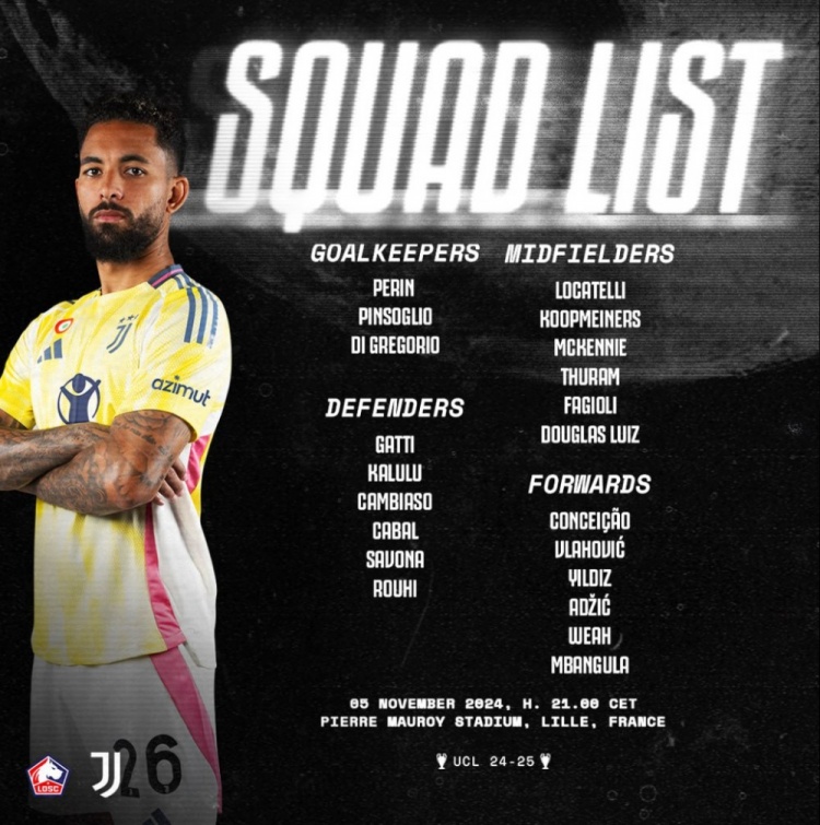 11月4日訊 北京時間11月6日凌晨4:00,歐冠聯(lián)賽階段第4輪,尤文圖斯將客戰(zhàn)里爾。賽前,尤文官方公布了本場比賽球隊大名單,弗拉霍維奇領(lǐng)銜鋒線,道格拉斯-路易斯坐鎮(zhèn)中場。