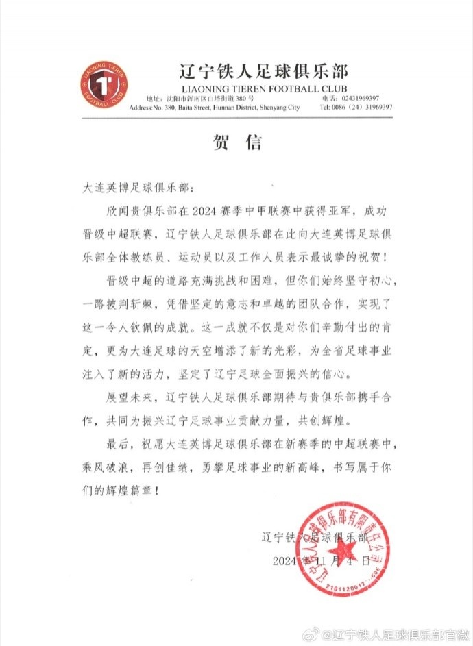 遼寧鐵人足球俱樂(lè)部在賀信中寫(xiě)道: