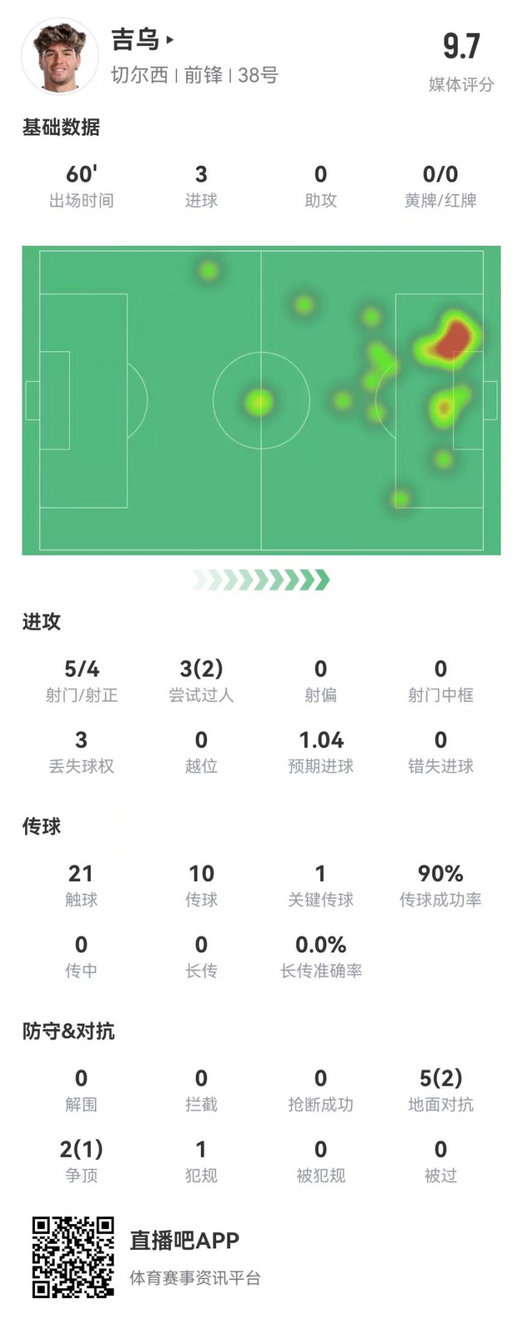吉烏本場(chǎng)數(shù)據(jù):5射4正進(jìn)3球 1關(guān)鍵傳球 7對(duì)抗3成功 獲評(píng)9.7分