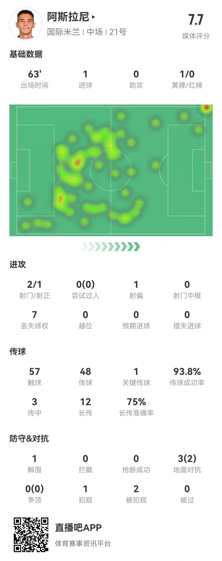 阿斯拉尼本場(chǎng)1球1關(guān)鍵傳球 12長(zhǎng)傳9成功+94%傳球成功率+2造犯規(guī)