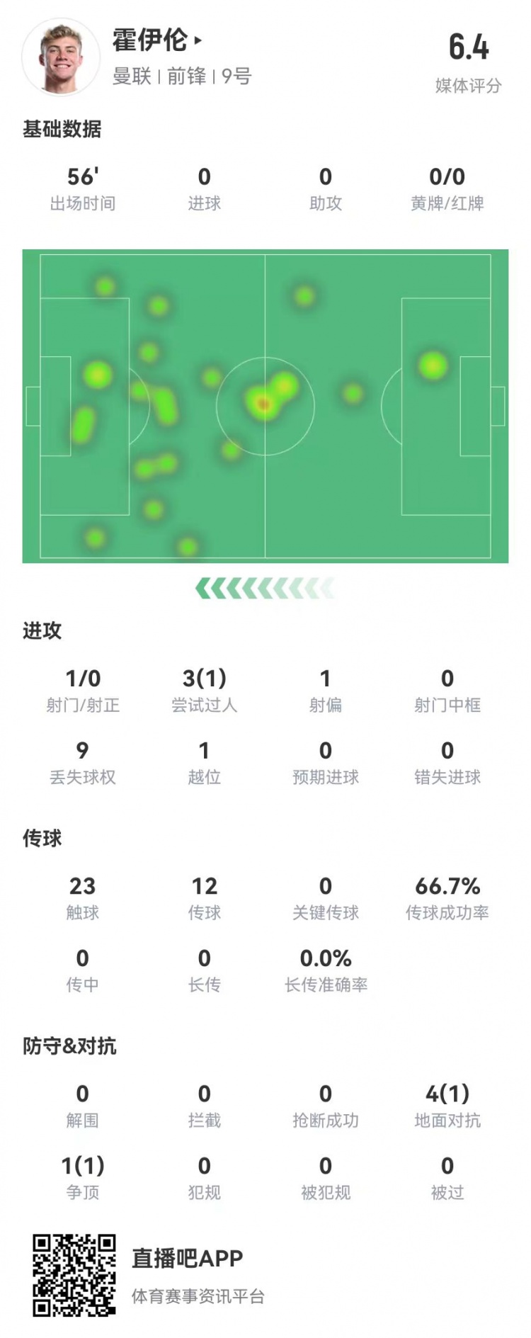 霍伊倫本場(chǎng)數(shù)據(jù):1射0正 3過(guò)人1成功 5對(duì)抗2成功 獲評(píng)6.4分